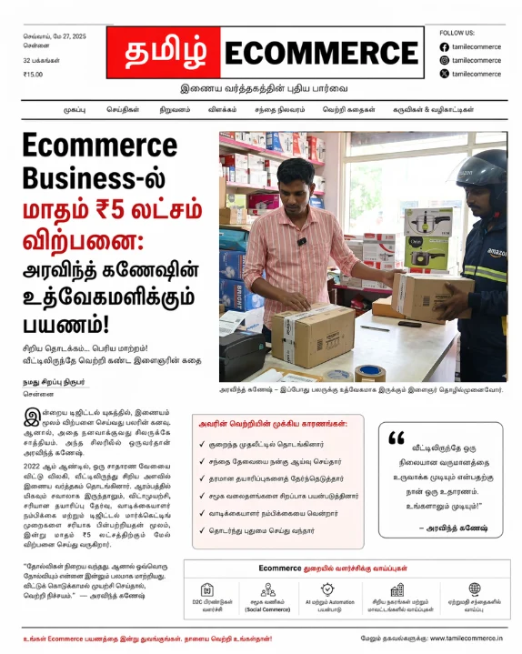 இன்றைய டிஜிட்டல் உலகில், பலரும் தேடுவது ஒரு நல்ல business ideas in tamil. ஆனால், யோசனைகளைத் தாண்டி அதைச் செயல்படுத்தும் விதத்தில்தான் வெற்றி ஒளிந்திருக்கிறது. நமது “Tamil Ecommerce” தளத்தின் ஒரு அங்கமான ‘செல்லர் ஸ்டோரி’ (Seller Story) பகுதியில், இன்று நாம் பார்க்கப்போவது அரவிந்த் கணேஷ் அவர்களின் வியக்கத்தக்க முன்னேற்றத்தைப் பற்றித்தான்.